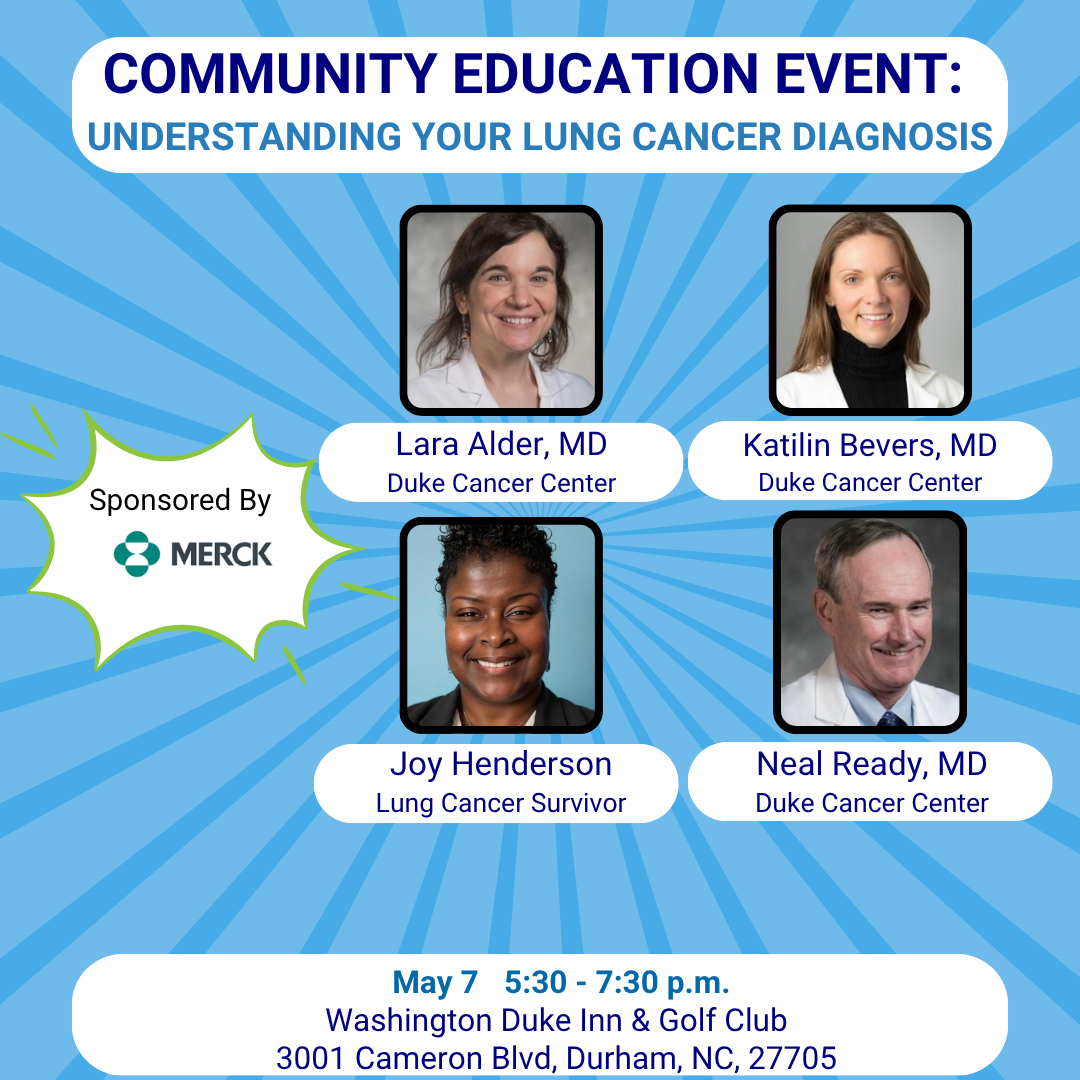 Enjoy refreshments, key information about lung cancer, and good company at the beautiful Washington Duke Inn & Golf Club. There is no charge to attend, but registration is required. Dinner will be provided. This event is open to all, including survivors, caregivers, researchers, clinicians, and anyone impacted by lung cancer. This community education event is a great opportunity to connect with others in the lung cancer community and stay informed on the latest developments.